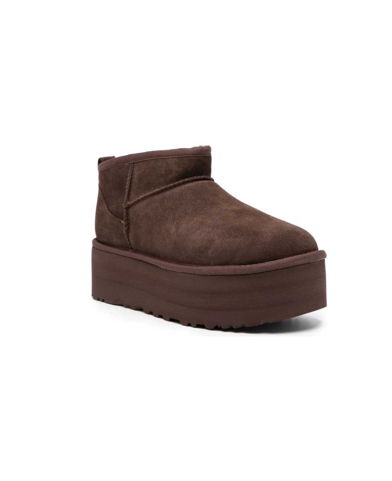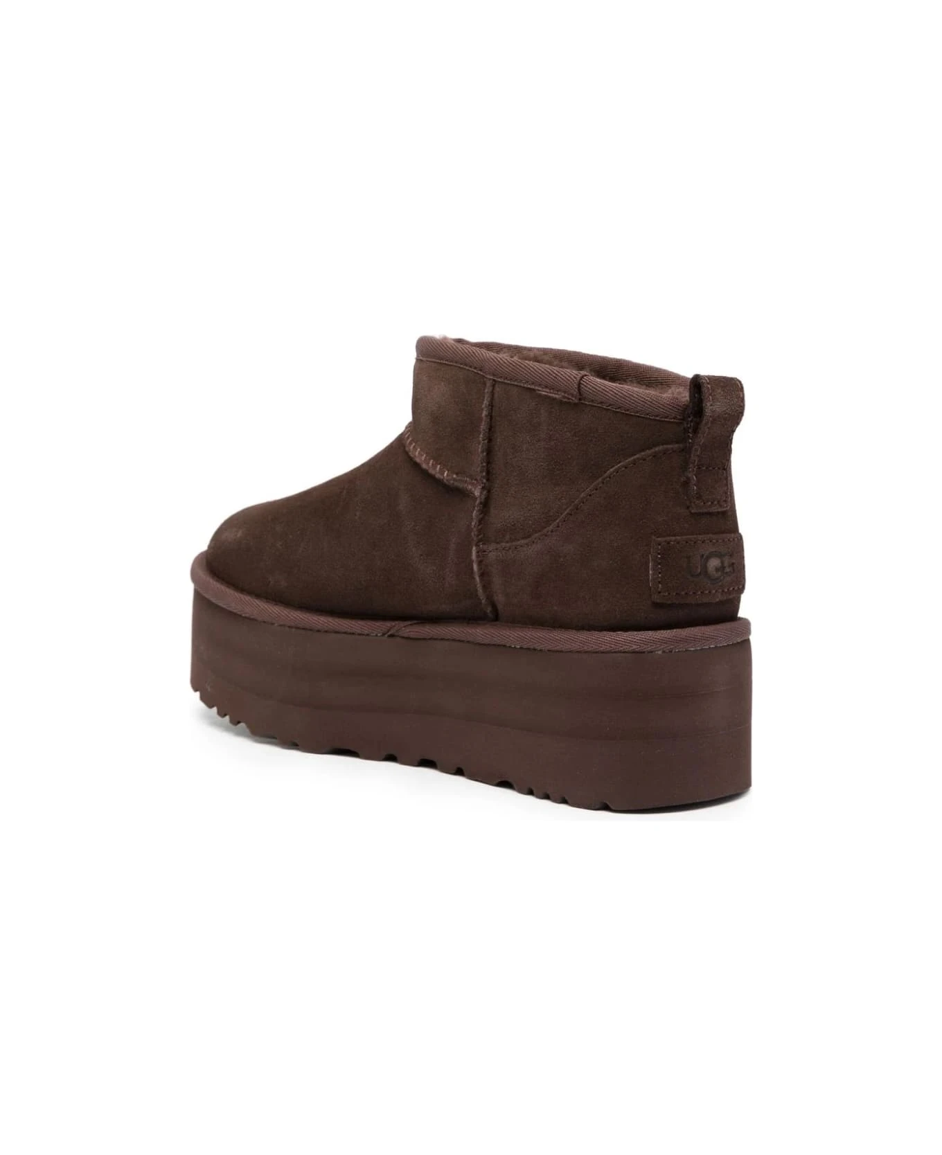 Burnt cedar-coloured Classic Mini II boots with a 5. 1 cm platform by UGG made from the same premium suede as the original and the usual UGGplush wool blend for classic softness. It sits on a SugarSole sole, made from a responsible sugarcane foam compound that reduces dependence on fossil fuels by replacing petroleum-based ethylene, or a Treadlite by UGG sole. Model with overlock detailing on the stitching, back pull tab, asymmetrical top edge, leather label on the heel with embossed UGG logo. Stitching in polyester or 100% recycled polyester. Leg height: 8. 9 cm. Platform height: 5 cm.